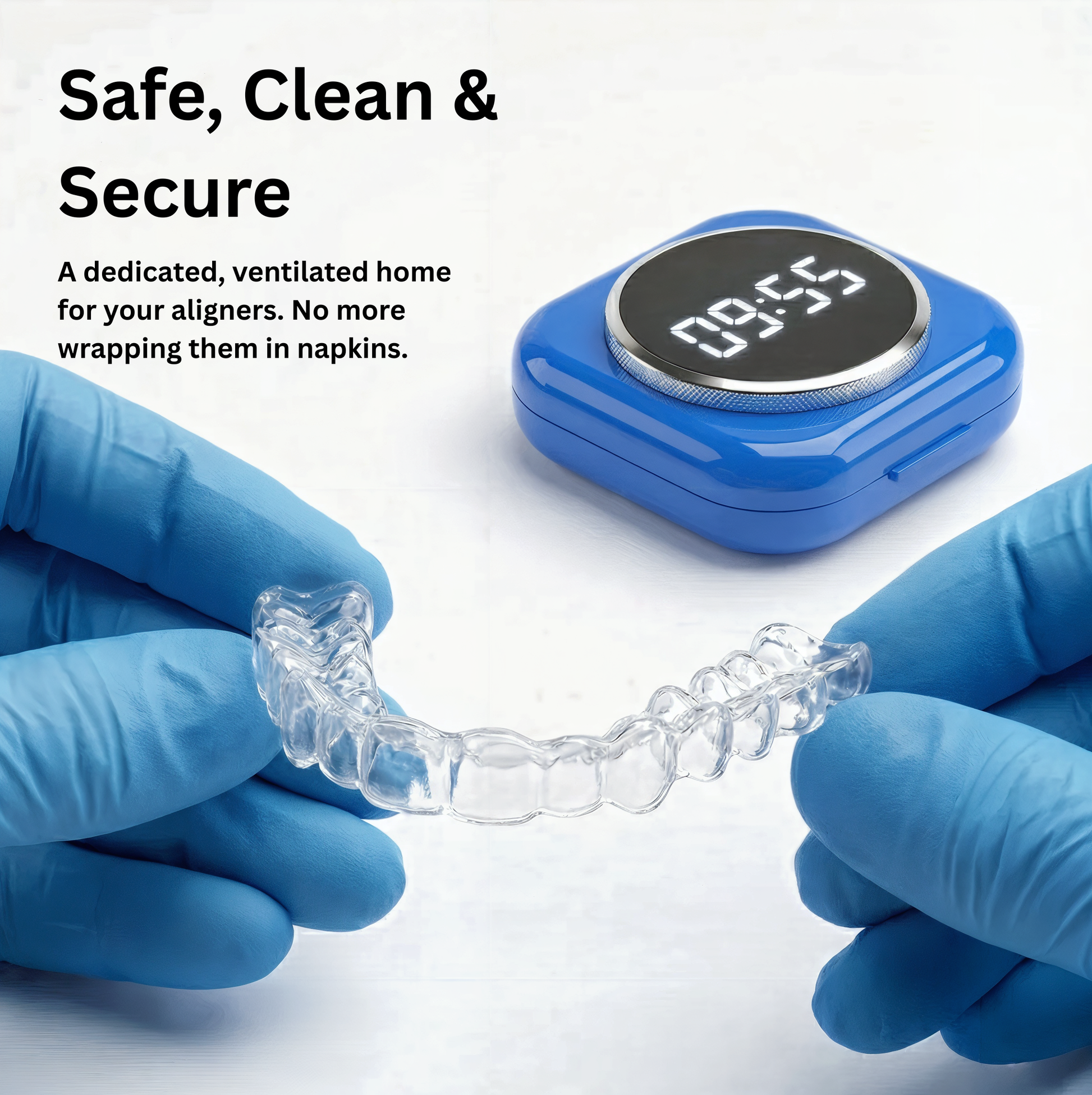 Remove your aligners → place them inside the case → set the desired time (10 minutes, 30 minutes, or custom time).